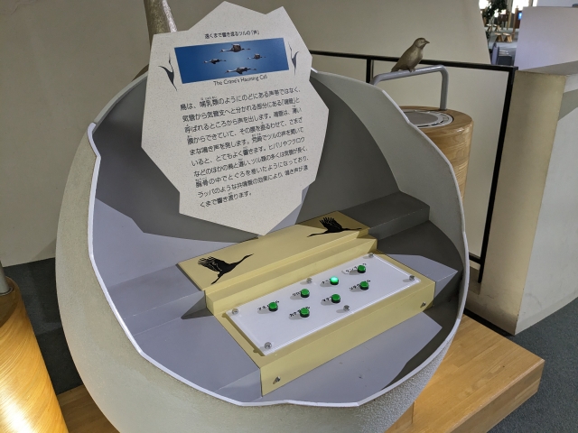 こちらは7種類のツルの鳴き声を聴くことができる装置。左右のスピーカーからステレオで流れてくる、立体感のあるサウンドが特徴的です。気になるツルの鳴き声ですが、体が大きい鳥であるため、とてもよく響きます。