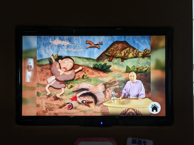 いわゆる生物学的な側面だけではなく、人とツルのかかわりについてといった文化的な面に関する展示も。茶色く四角いポストみたいなテレビでは、様々なツルと人とのストーリーを見ることができます。