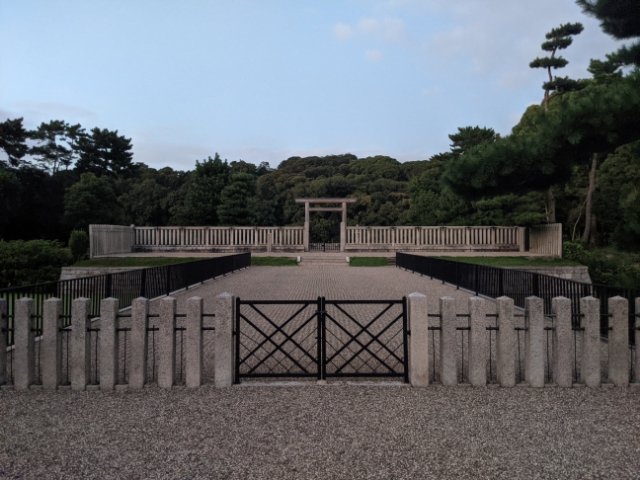最も古墳に近づけるのが、古墳の南側に位置する拝所。薄暗い中、人が立ち入ることができない森が広がる様子からは畏怖を感じます。