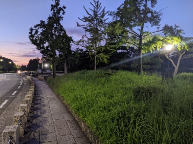 古墳の周りの道は街灯が設置されており、ランニングしている人の姿が目立ちます。きっと古墳一周ランは、この辺りの住民の間ではおなじみのコースなのでしょう。