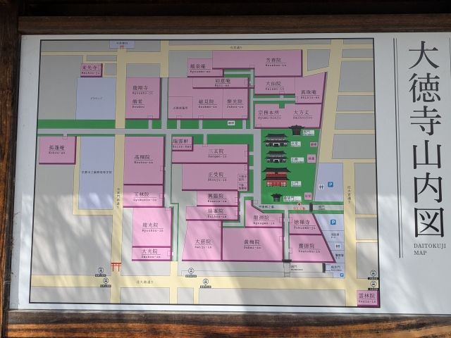 前述の通り、大徳寺は24もの塔頭寺院を有しています。塔頭(たっちゅう)というのは、大きな寺院の中にある独立した寺院のこと。下図のピンクのところが塔頭寺院。ぎっしりつ詰まっています。