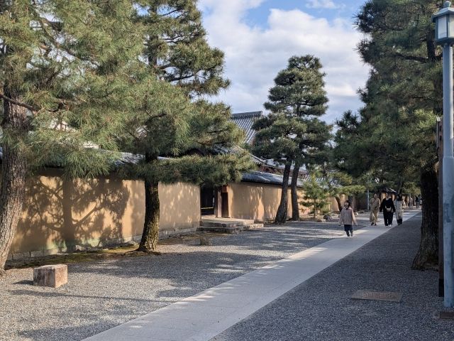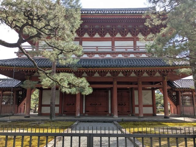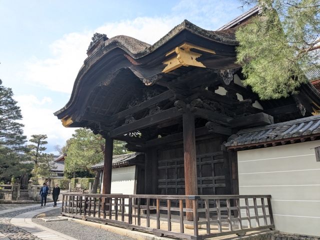 東側の総門をくぐり、最初に見える建築は、唐破風がついた豪華な姿の勅使門。慶長年間(1596~1614年)に造られた御所の門であり、寛永17年(1640年)に後水尾上皇より下賜され移築されました。基本的に閉ざされており、柵もあるため近づくことはできません。