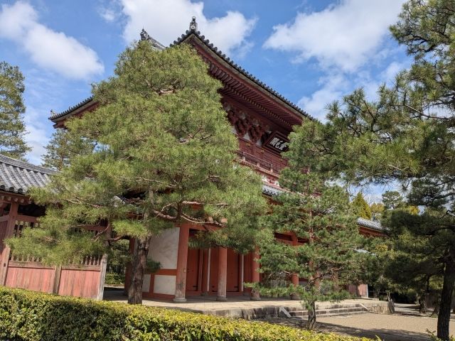 勅使門の先にあるのは立派な山門。存在感は抜群ですが、垣根で近づくことができず、生い茂る松の木であまりよく見えません。