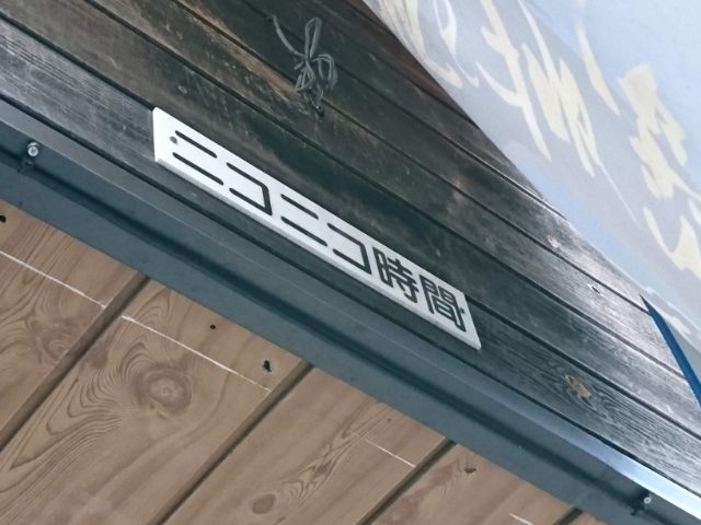 垂れ幕の裏には「ニコニコ時間」と書かれたプレートを見つけてしまいました。もしかして上述の「ニコニコ標準時」を示す時計があったのではないでしょうか。