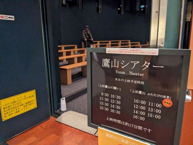 鷹山シアターでは、毎時00分に「上杉鷹山 ふたたびの改革」、30分に「上杉鷹山の闘い」と、それぞれ約17分間の映像作品が上映されています。3面スクリーンを使用した映像作品はなかなかの迫力。