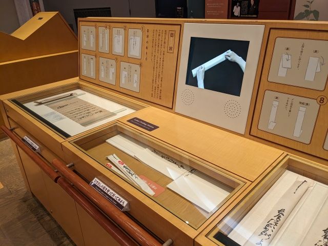 古文書の折り方体験もあります。体験のサンプルとして置かれているのは、足利義輝の御内書や豊臣秀吉の朱印状。当時の重要書類を自分で折って持ち帰れるのは、ちょっとわくわくしますね。