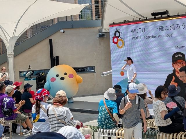 待機中は、広場で開催されているイベントが見えます。『Happy』(Pharrell Williams)や『APT.』(ROSÉ & Bruno Mars)といった誰でも知ってる曲で踊る楽しげな雰囲気。なんかゆるキャラみたいなのがいますね。