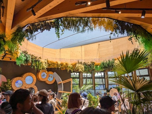 気を取り直して本日最初のねらいはドイツパビリオン。大屋根リングの北東、東ゲートから近くにあります。円を描いた特徴的な木造建築は、テーマである「循環経済(サーキュラーエコノミー)」をイメージしているそう。