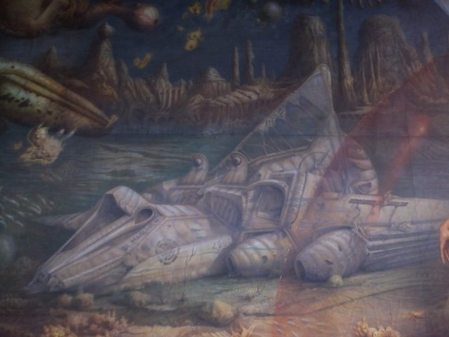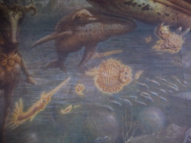 大きさに圧倒されますが、よく見てみると描かれているものが面白い。カンブリア紀の古生物のような不思議な生命体が無数に泳いでいます。