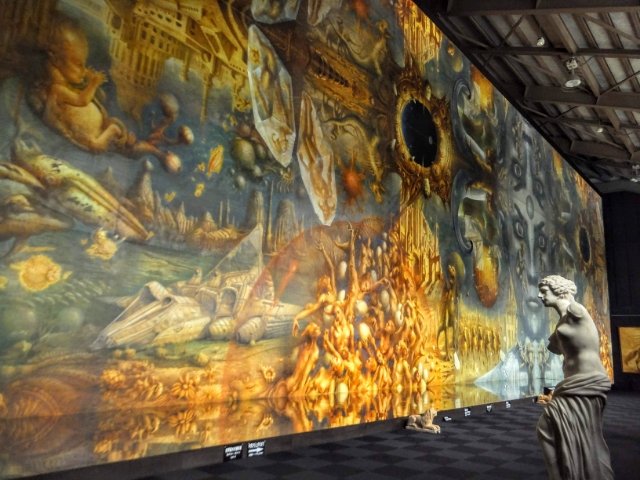 そんな巨大絵画ですが、なんとプロジェクションマッピングによるショーがあります!タイトルは『宇宙の謎、神秘の美しさ、光の不思議に迫る』。毎時30分・上映時間約8分のプログラムで、音楽と照明・ナレーションによるショータイムがはじまります。何かストーリーが語られたりすることはないのですが、時を越える壮大な旅に出たような気持ちになりました。