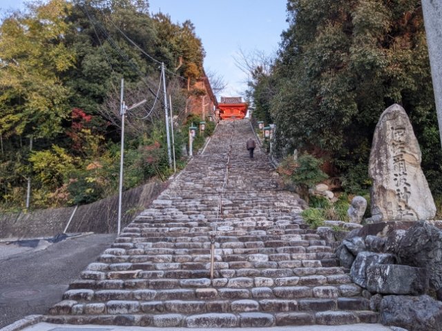 道後温泉駅から東へ300mほど進むと、そびえる石段が見えてきます。こちらは伊佐爾波(いさにわ)神社の参道。