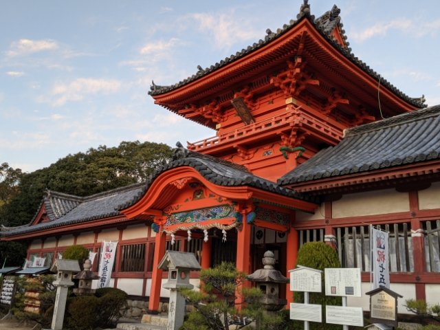 登った先には朱色があざやかな楼門。別名、「道後八幡」とも呼ばれる神社で、はるか昔に仲哀天皇と神功皇后が道後温泉に訪れた際の行宮跡地に建立されたと伝えられています。