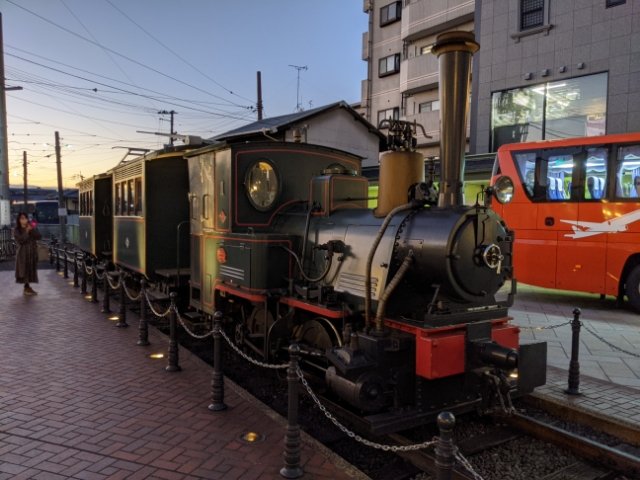 駅前にあるレトロな車両は「坊っちゃん列車」。展示用の車両かと思いきや、土日祝日には街中を走ることがあるそうです。気になる方は、運行予定をHPにて確認してからの訪問がおすすめです。