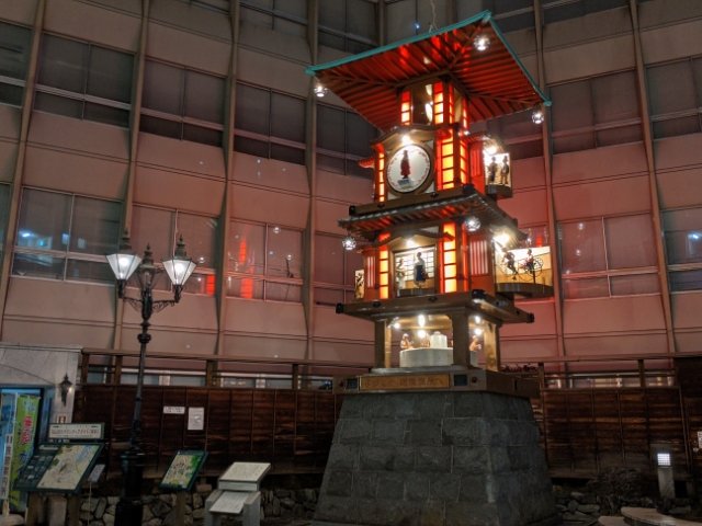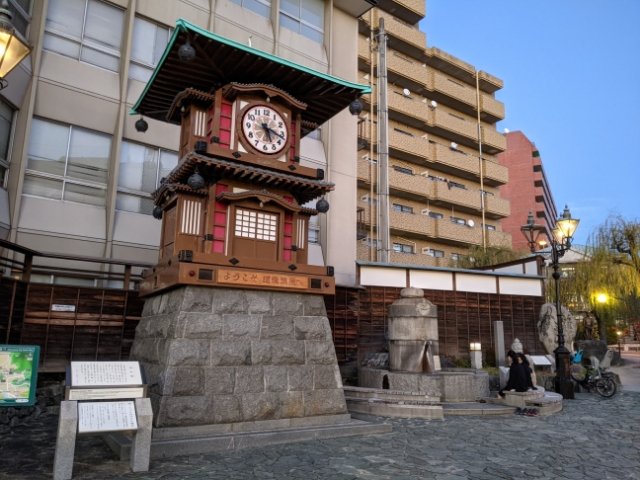 道後温泉駅の目の前にあるこちらの時計は、坊っちゃんカラクリ時計。隣には足湯もあります。地元の中学生が浸かって話している様子は微笑ましい。