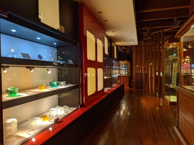 この建物の地下にあるのが道後ぎやまんガラス美術館。江戸、明治、大正時代に国内で作られたガラス作品を中心に、約300点を展示するミュージアム。開館時間は9:00〜22:00と非常に長いため、温泉に入った後でも立ち寄れます。