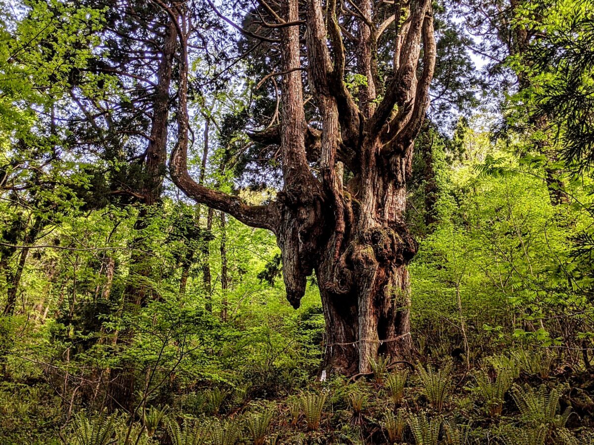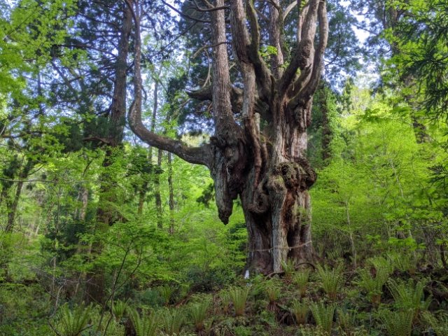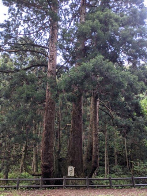 旅行雑誌などでよく見かけるのは根元にクローズアップした写真ですが、少し離れて見るとだいぶ印象が変わります。枝分かれした株が天高くそびえており、この杉1本だけで森と呼びたくなるような存在感。
