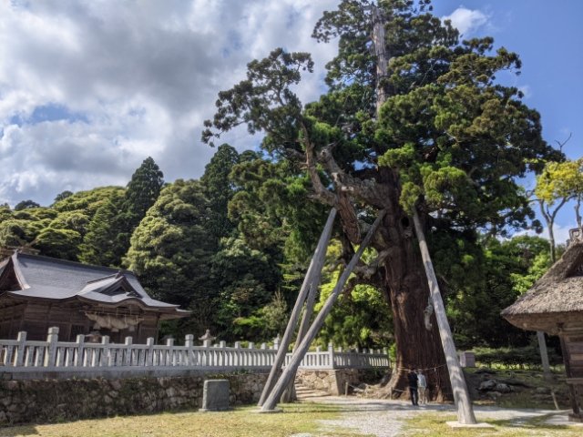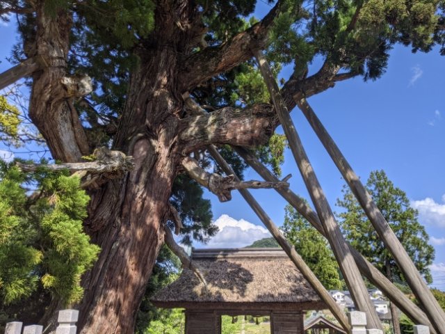 玉若酢命神社の随神門に被さるようにそびえる杉の巨木は八百杉(やおすぎ)。樹高は約30m、幹周りは11mもあります。玉若酢命神社が西郷港から車で5分とアクセス良好なため、この杉も非常に見に行きやすい杉です。