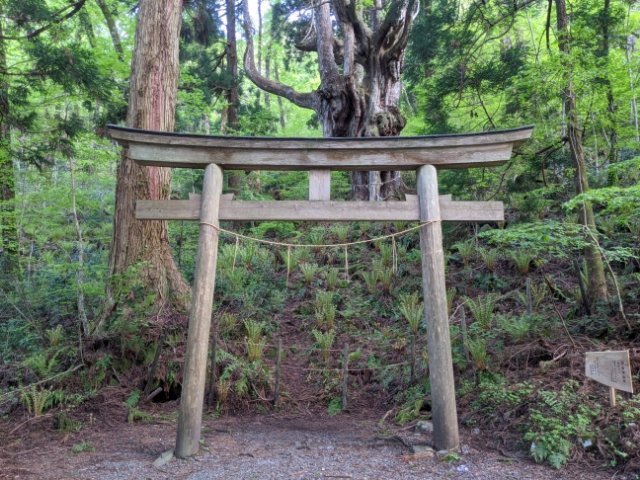 大山神社に社殿は無く、鳥居の先にそびえるのは樹高40m、樹齢800年といわれる古木。山全体を祀る、非常に原始的な神社なのです。