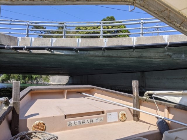 西郷湾めぐりを終えると、次は八尾川へ。橋をくぐって放水路から川へと入っていきます。舟の高さぎりぎりの橋の下。ちょっぴりスリルもあります。