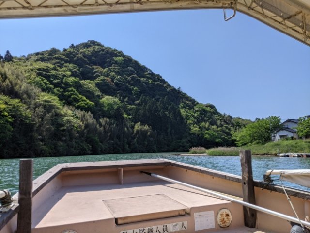 そのまま舟は八尾川を上っていきます。緑が美しい水面と豊かな自然、市街地のすぐ近くであるというのに、まるで山奥の秘境のような美しい光景が広がります。