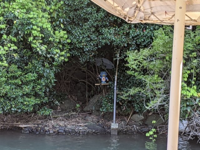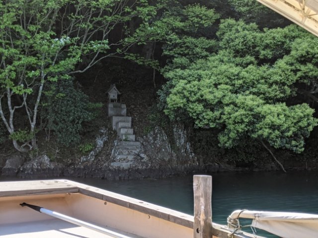 今回のコースで最も奥地となるのがかっぱ淵と呼ばれるポイント。ここには水神様の祠があります。階段はあるけど道はなく、舟でしか行けない祠なのです。