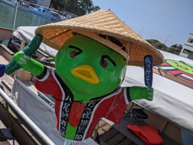 この八尾川にはカッパ伝説が残されています。川辺にはカッパの像が並ぶ八尾川かっぱ公園があり、遊覧船のコース上でも、よく見るとカッパのオブジェが何体か隠れています。