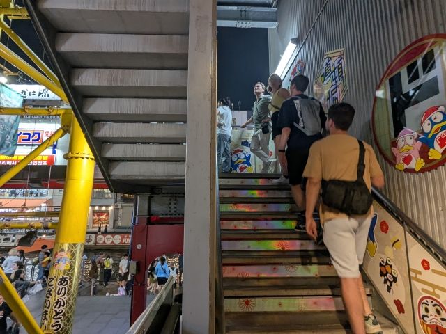 描かれているのは、ドン・キホーテのキャラクター「ドンペン」と、七福神の恵比寿様こと「えべっさん」。派手なデザインは、道頓堀エリアの個性的な看板に引けを取りません。