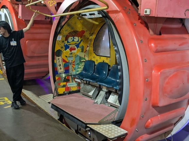 スタッフさんが安全バーを降ろしてくれます。観覧車で安全バーなんて珍しいなと思っていると、ガガガという音とともに座席が回転しました!!
