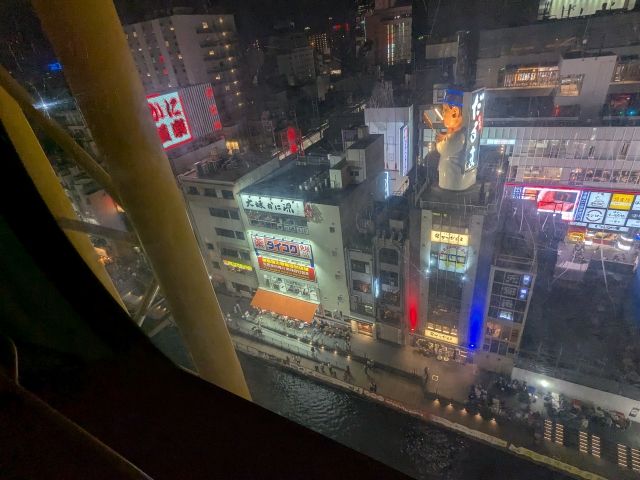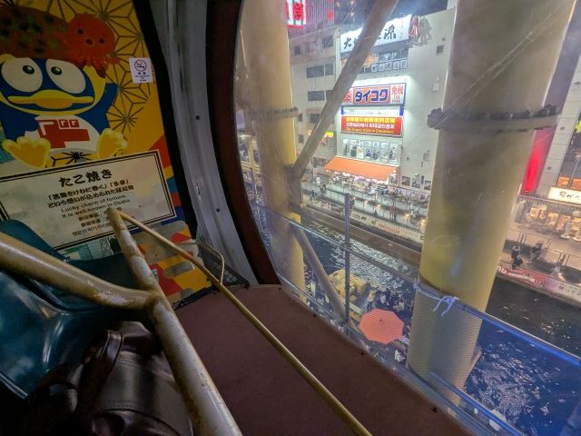 といっても垂直回転ではなく水平回転。乗車時は店舗側を向いていた座席は、上昇するタイミングでぐるっとまわって道頓堀側を向きます。世界初の座席が水平回転する観覧車とのこと。
