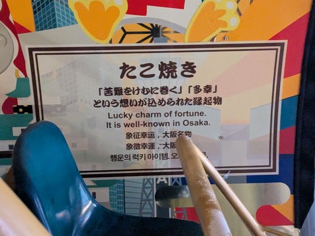 最後の1枚はこちら!ゴンドラ内の「縁起物紹介プレート」。そこには「たこ焼き:苦難をけむに巻く、多幸という想いが込められた縁起物」と記載されています。