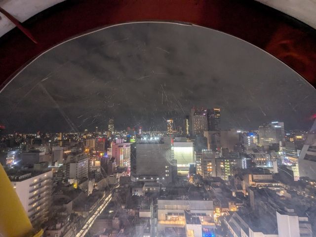最高位置は77.4m。南を向いているので、「あべのハルカス」もばっちり見えます!窓はキズや汚れで少し曇ってしまっていますが、キラキラした夜景は充分に楽しめます。