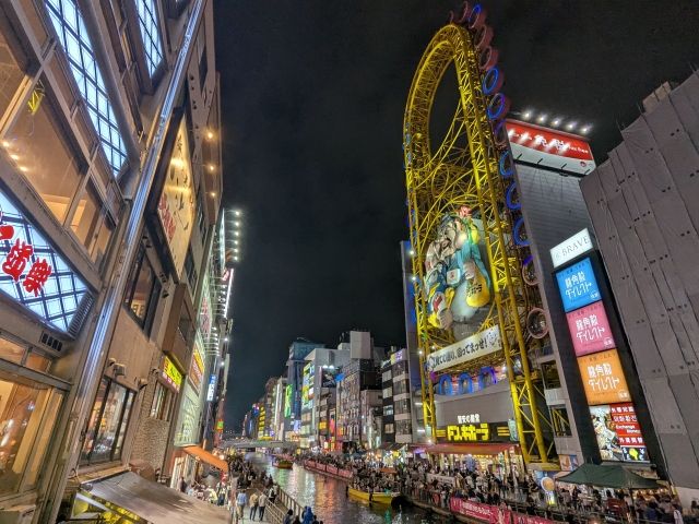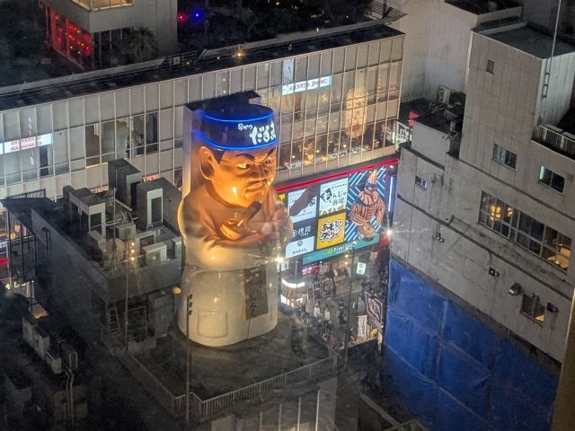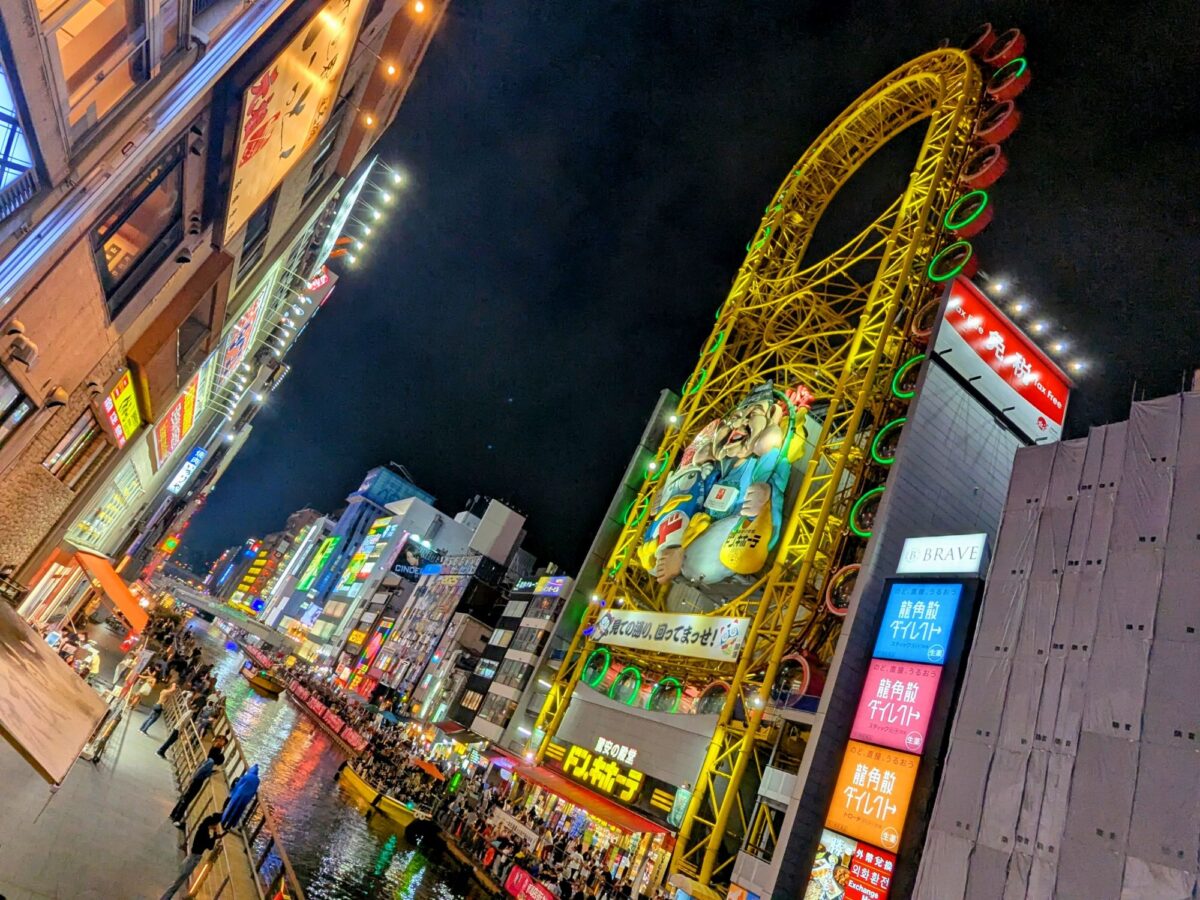 回転した先に広がるのは、ネオンで色づいた華やかな道頓堀の景色。ビルの上にたつ巨大な串かつだるまの人形「だるま大臣」はあっち向いちゃってました。