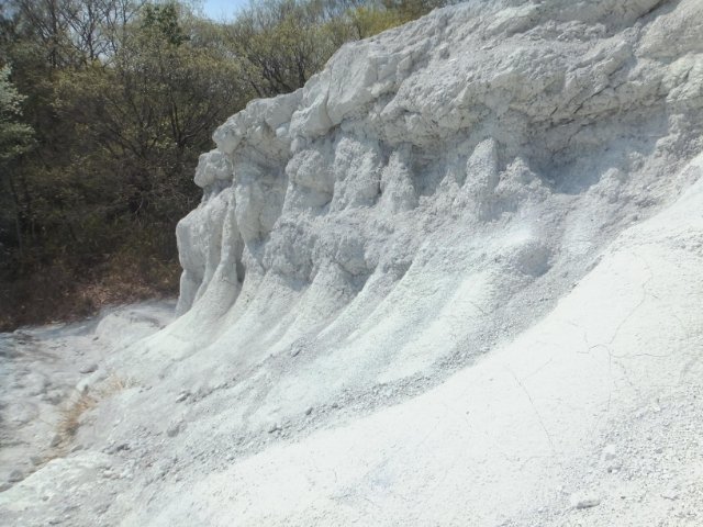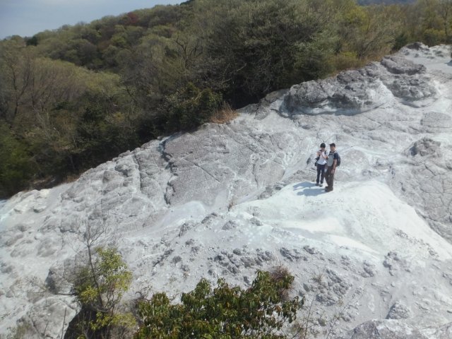 この真っ白な岩は、凝灰岩という火山灰が凝縮されてできた岩。