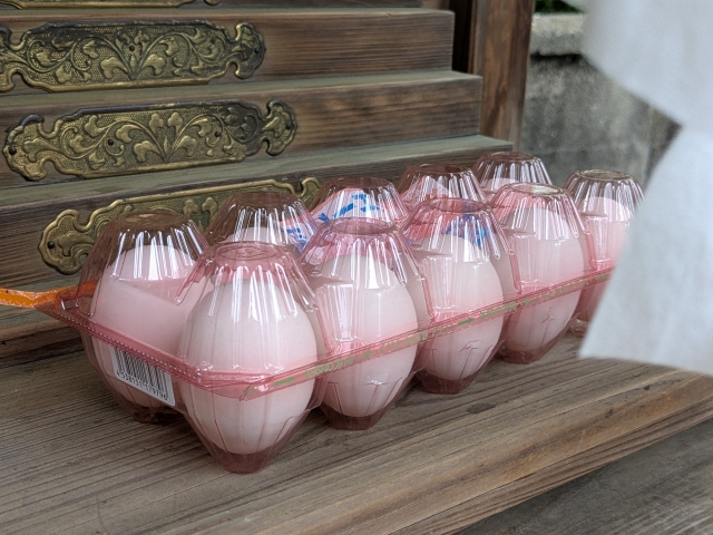 蛇神であることからか、卵のお供え物も見かけました。パック毎供えられていますが、カラスか何かに荒らされてしまったのか参道に落ちてしまっています。