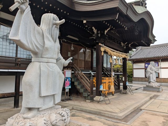 目を引くのは拝殿の両サイドに構える天狗の像。2m程となかなかの大きさで、強い存在感を放ちます。波の上に立つのは神通力で海を渡っている姿でしょうか?