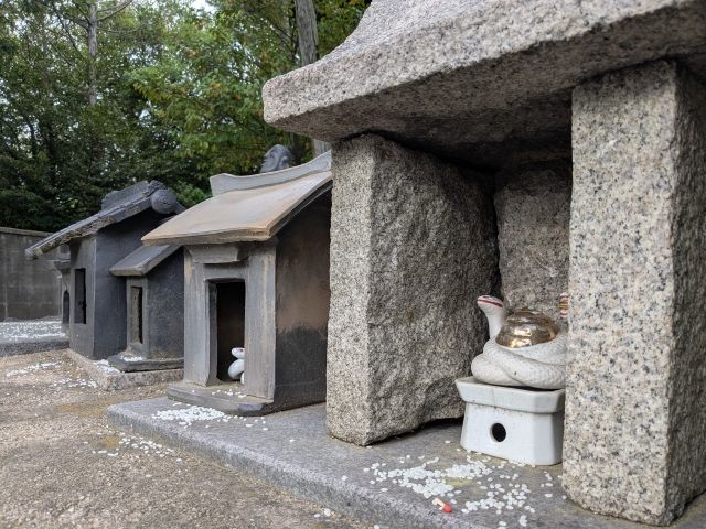 社殿の裏手には、信者によって奉納された瓦や石の小さな社がたくさん!この社、中を覗いてみると、全てヘビが祀られています。