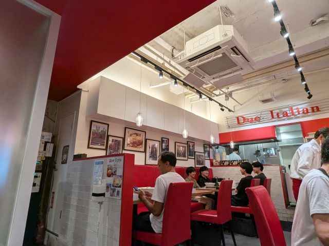店内はやっぱりカフェのようなおしゃれな雰囲気。赤と白のコントラストが鮮やかな内装、ジャズのBGMもぴったりハマります。そんな中で学生らしきグループがマッチョの話で盛り上がってて微笑ましい。それ以外の客層は女性一人客が中心です。