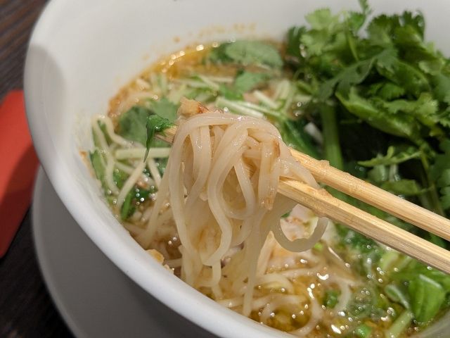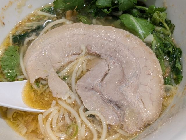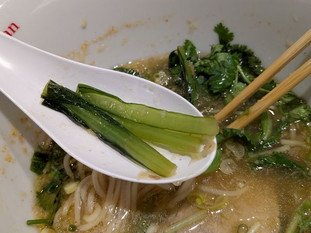 酸味と辛味のあるスープにパクチーが組み合わさると、超強力なエスニック感。パクチーの茎もたっぷり。あれ、パクチーの茎ってこんなに太かったっけ?もしかしコマツナとかかな?(※野菜音痴発動)