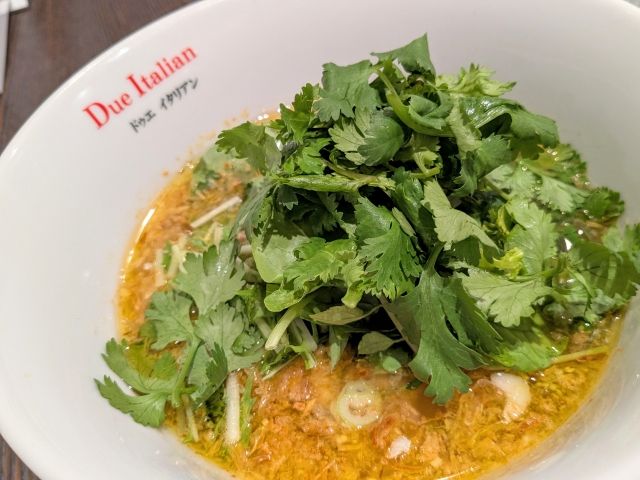 4度目の訪問となるドゥエ・イタリアン。今回は「レモンらぁ麺」をさらに進化させた「レモンパクチー辛いらぁ麺」に挑戦!酸味と辛味が混じったスープにたっぷり乗ったパクチーが、アジアンテイストなヌードルメニューです。