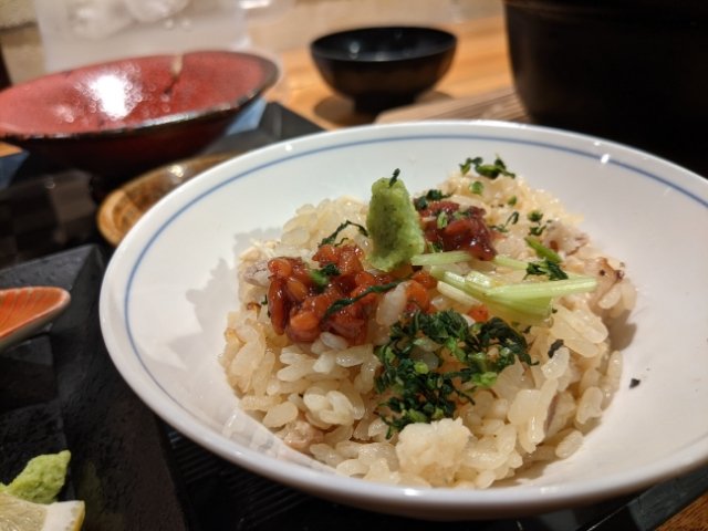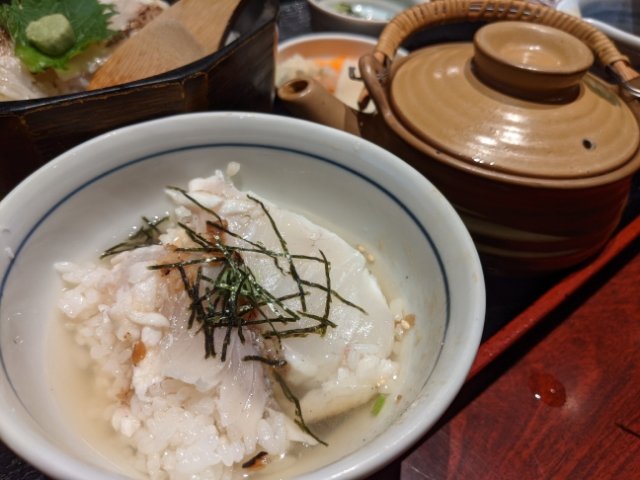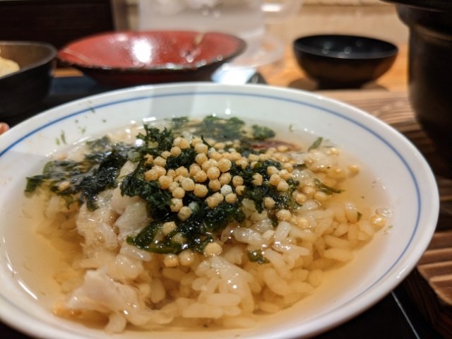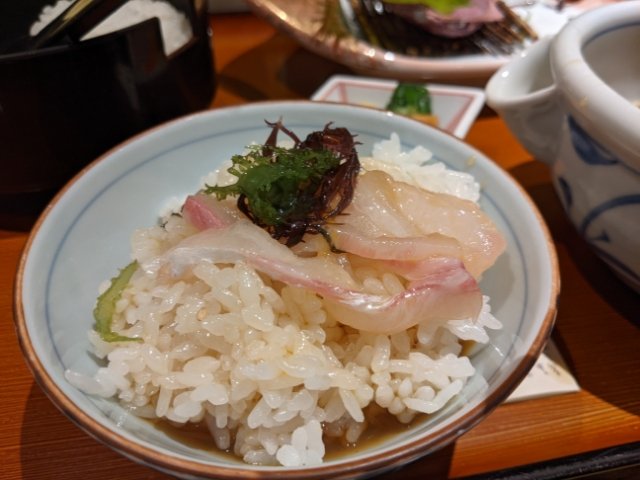 2つ目は、同様に器によそった鯛飯にひしお+お出汁をかけて食べるお茶漬けパターン。ワサビをそえてさっぱりといけます。お出汁には鯛の旨味が凝縮されており、これだけ飲んでも美味でした。