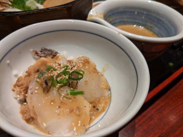 このあぶり鯛飯の食べ方は2パターン!1つ目は、器にご飯と鯛をよそって、薬味とひしおダレをかけて食べます。ひしおダレはもろみ味噌みたいな風味の甘口で、蛋白な鯛の炙りと相性抜群。薬味にレモンがあるのですが、これが不思議なくらい合います。(※ひしおというのは麹を醤油に漬けて発酵させた調味料のことです)