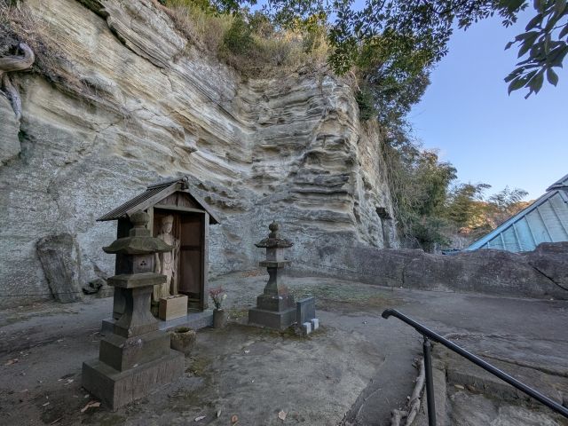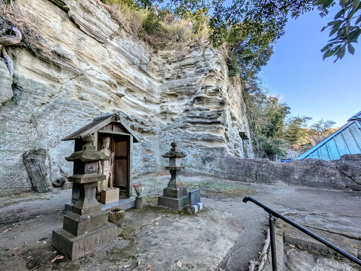 三霊社権現の先の石段を上ると聖観自在菩薩。その隣には小さな太子堂も祀られていました。岩肌をくりぬいて造ったテラス状のスペースであり、境内よりも一段高いため見晴らしも良いです。