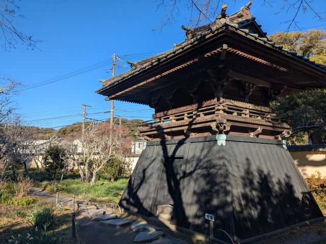 裾が広がった独特な姿の鐘楼。このスタイルは「袴腰鐘楼(はかまごししょうろう)」と呼ばれており、鎌倉で唯一とのことです。