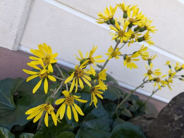 通用門にはその日に鑑賞できる花の札が掲げられています。1月に訪問したところ、ツワブキが見ごろとの掲示が。