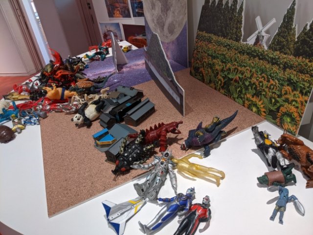 自由に遊べるフィギュアもたっぷり。懐かしのウルトラマンや怪獣、動物など様々なフィギュアが散らばっており、大人も童心に帰って遊べます。