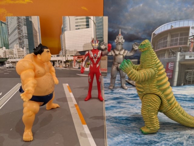 ここでは、写真の背景も置かれています。そう、建物や怪獣を使って自由にジオラマ撮影が楽しめるのです!こんな謎のドリームマッチも設定可能です。