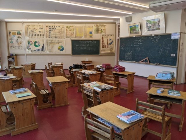 館内には、そんな円形校舎の教室を再現したコーナーもあります。建物の中心側に黒板があり、窓側にいくにつれて幅が広がる扇形の教室。大学の講堂のような姿です。