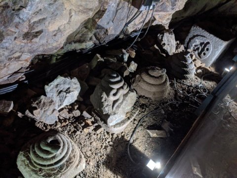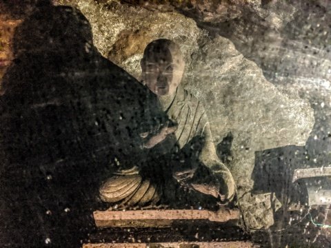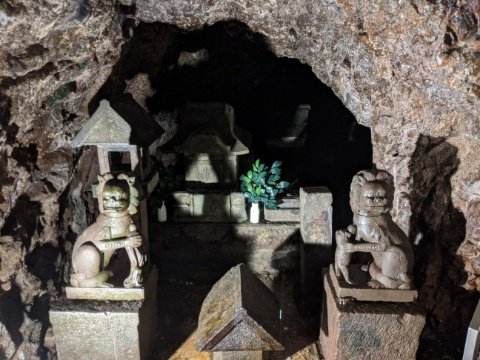 人々は、岩屋へ参詣する「岩屋詣で」の度に石造物を奉納していました。洞窟内には、弁財天像や役行者像、弘法大師像やとぐろを巻いた蛇のカタチをした巳像など今でも多くの石造物が残っています。