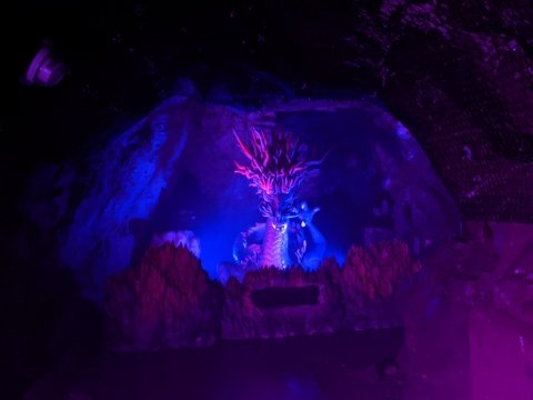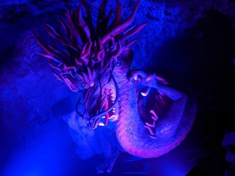 第2岩屋の最奥に鎮座するのはドラゴン!ブルーとピンクに照らされており、周囲には唸り声が響きます。