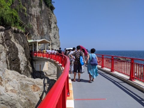 最寄り駅は小田急線の片瀬江ノ島駅ですが、そこから徒歩で40〜50分かかります。江の島弁天橋を渡り、階段もしくは有料エスカレーター「江の島エスカー」で登っていく長い道のり。途中にはお店や食事処、江島神社などの見どころが多く決して退屈な道のりではありませんが、起伏の多い道のりはなかなかハード。